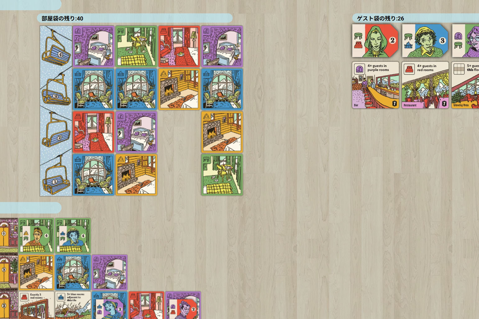 あと、部屋タイルのかわりに「赤部屋をちょうど3つ」とか「このタイルの周りに青タイルを5枚以上」といった目標タイルを取ることも可能。