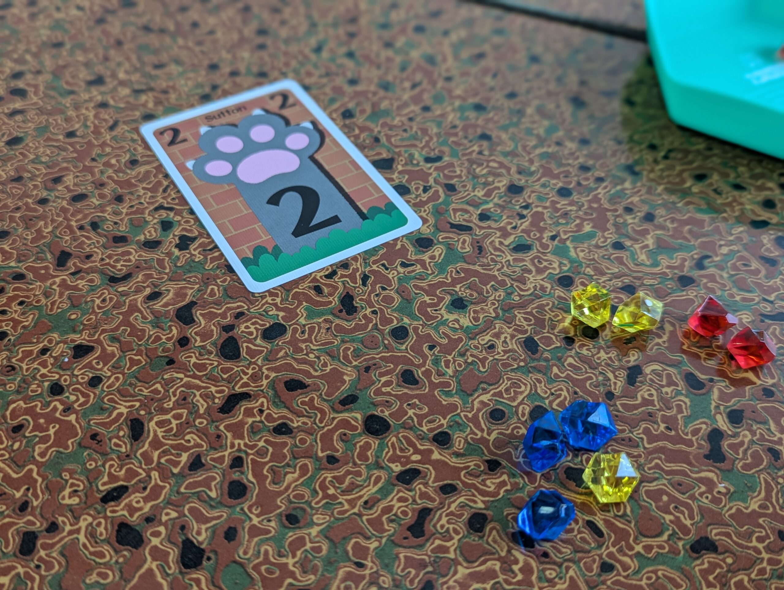 スタートプレイヤーから出したカードをめくって、そこに書かれた数だけ場から宝石を取る。